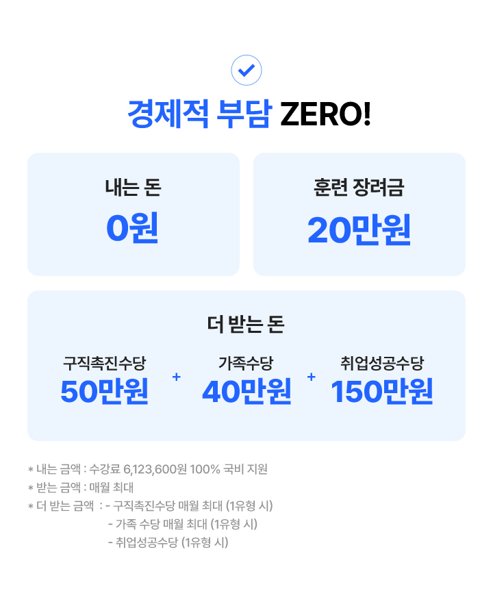 단위기간별(훈련일) 80%이상의 출석률이 되어야 받을 수 있으며, 1일 * 10,000원으로 최대 20만원 지급됩니다.