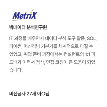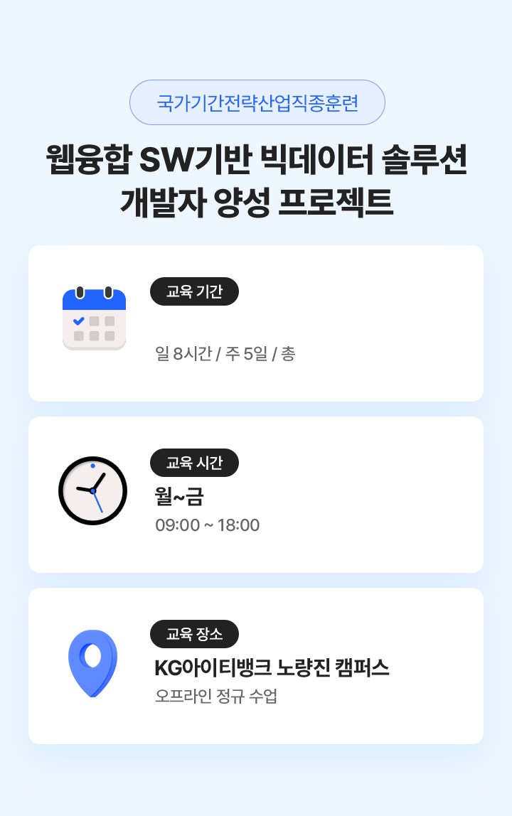 빅데이터 플랫폼 구축을 위한 프로그래밍 언어 활용, DB시스템 구축, 웹 융합 SW 개발 기술 등을 습득하여 빅데이터 솔루션 및 데이터 분석 기법을 활용한 SW전문가로 취업하는 과정