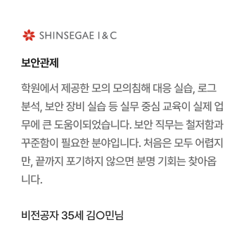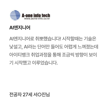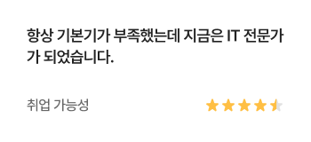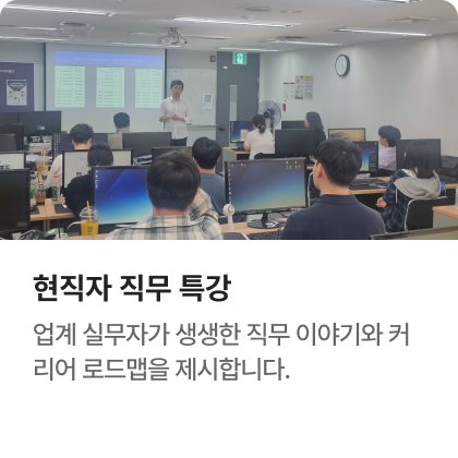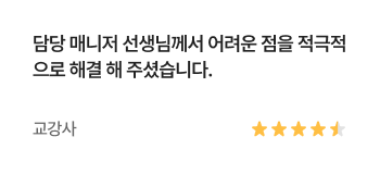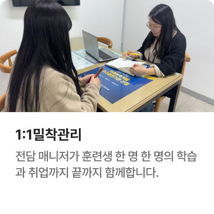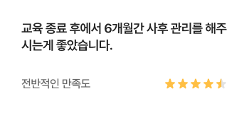 과정중에는 취업지원상담, 취업특강이 진행되며, 과정 수료 후에는 6개월간 사후취업관리를 받으실 수 있습니다.